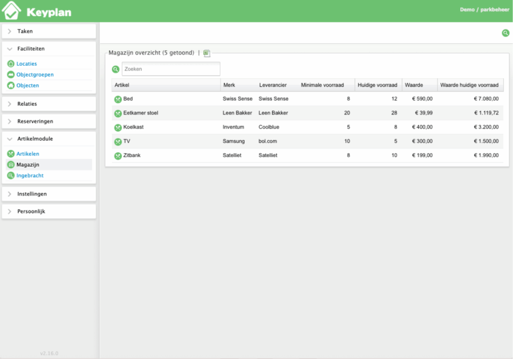 De artikelmodule is een slimme en overzichtelijke oplossing voor vakantieparken. In één systeem zie je per accommodatie welke artikelen zijn ingebracht en krijg je direct inzicht in het totaaloverzicht van alle artikelen, inclusief merk, leverancier en waarde.