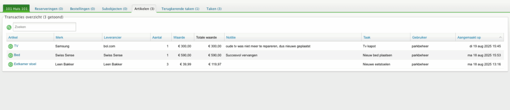 - Direct inzicht per object: zie welk artikel is ingebracht, de hoeveelheid en totale waarde.